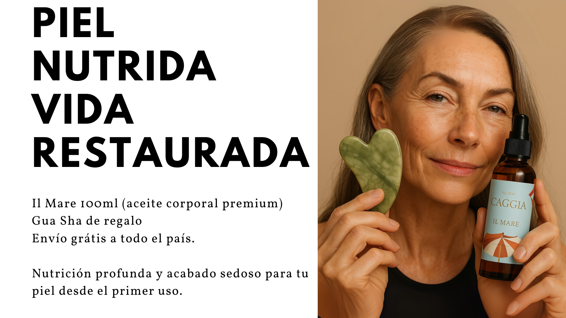La hidratación superficial no alcanza: se necesita nutrición profunda + estímulo mecánico suave. El Starter Kit combina Il Mare 100 ml con una Gua Sha para mejorar la elasticidad, suavizar textura y favorecer el confort de la piel.